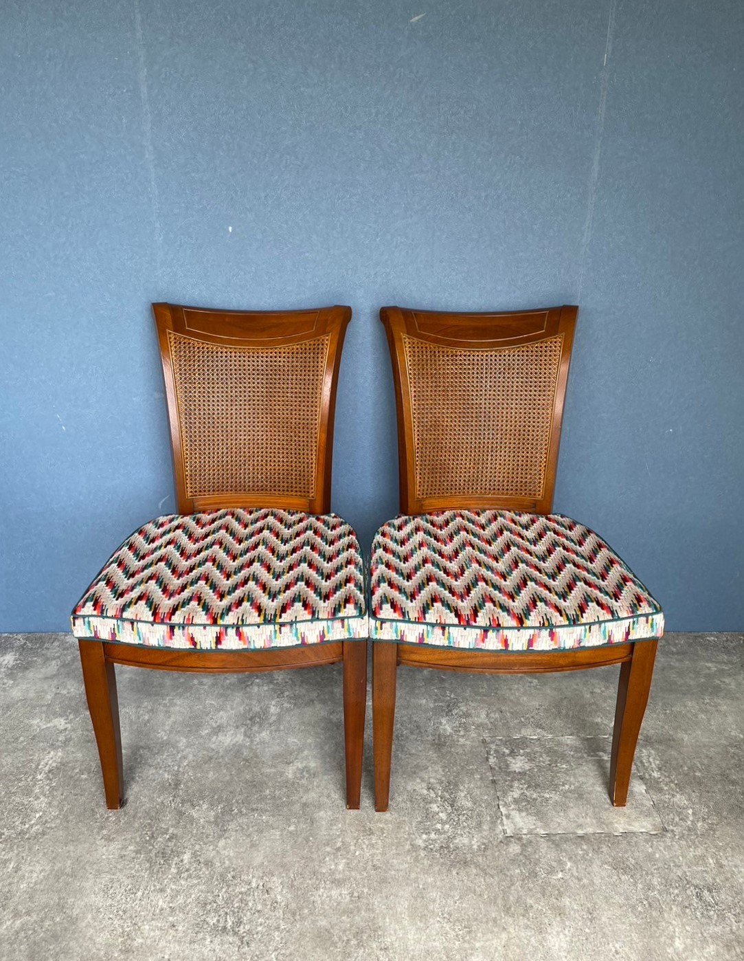 張り替え後の仕上がりは、見違えるような印象です。注目すべきは、2脚それぞれを別の色で張り替えた「バイカラー仕上げ」。