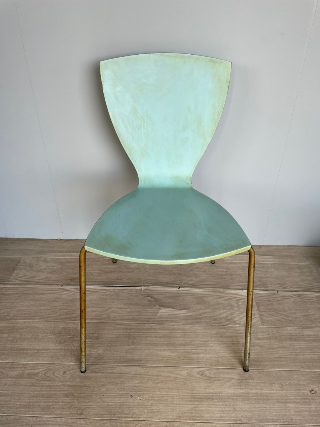 この椅子は、木製の背と座面が一体型になった非常にシンプルなデザインで、脚部は細めの金属パイプ。いわゆる“ミニマルデザイン”の椅子ですが、複数脚を積み重ねて保管・運搬できる「スタッキングチェア」として、飲食店やワークスペースなど色々なシチュエーションで活躍しそうな汎用性の高い椅子です。