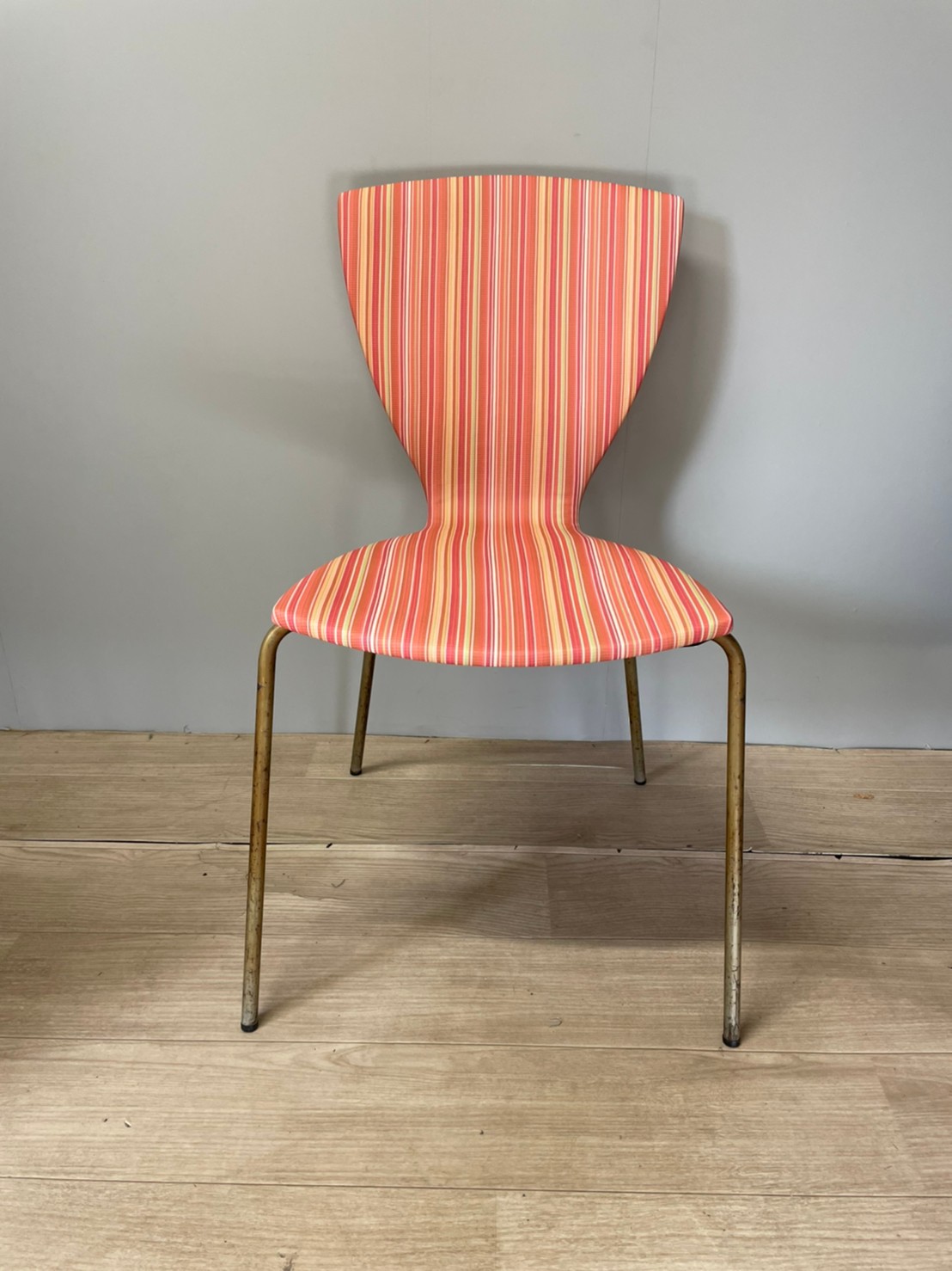 ご紹介するのは、インテリアブランドIDÉE(イデー)のスタッキングチェアを、ポップなストライプ柄合皮で張り加工した事例です。