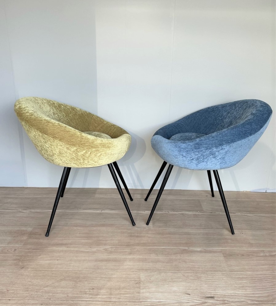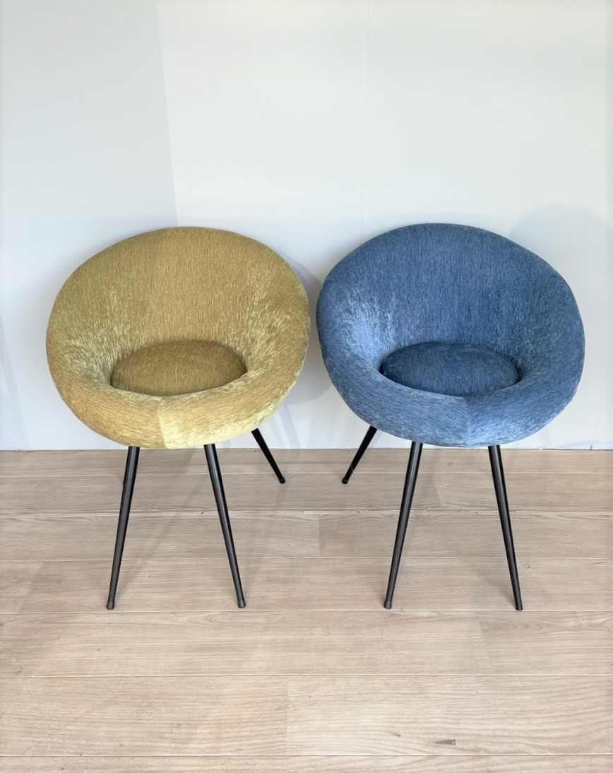 フォルムそのものは非常にユニークで可愛らしく、スチール製の細脚との組み合わせもスタイリッシュ。まだまだ活躍できるポテンシャルを感じさせるチェアだけに、張り替えによって再生する価値は十分にありました。