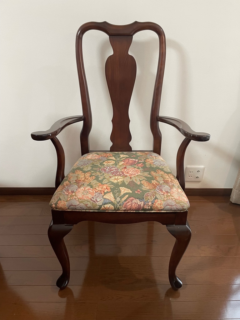 張り替え前のチェアは、濃いブラウンの美しい木製フレームに、クラシカルなタペストリー調の花柄ファブリックがあしらわれていました。座面はベージュをベースに、ピンク、オレンジ、グリーンなどが織り込まれた多色使いの生地で、まさに“重厚感のある上品な椅子”という印象。
