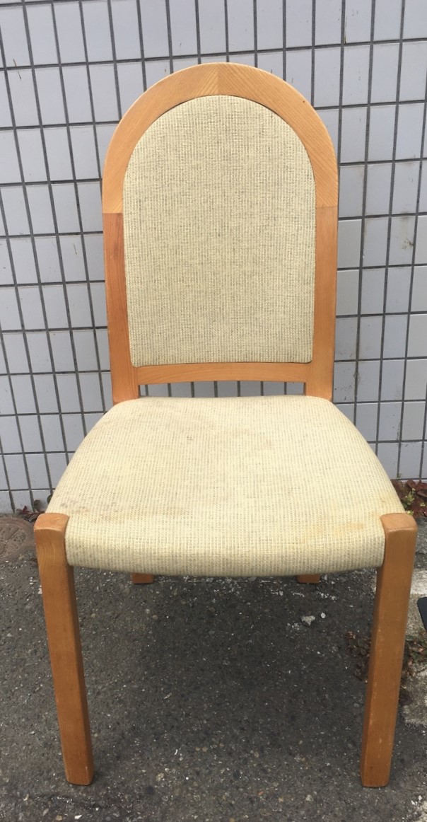 今回ご紹介するのは、ナチュラルな木製フレームにベージュ系の布地が張られていた、家庭用ダイニングチェアです。何年も使われてきた様子がよく現れており、座面には広範囲にわたってシミが広がり、背もたれにも黒ずみが目立つ状態でした。