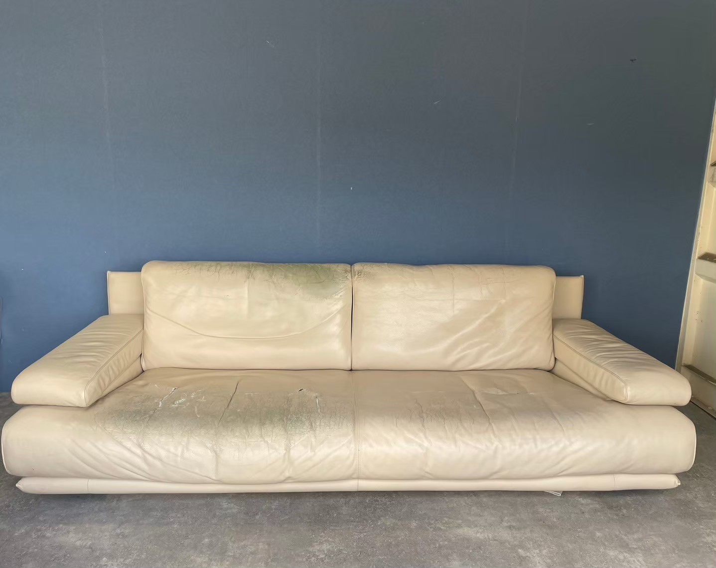 身体を預ける「座面」と「背もたれ」のクッション部分は、日々の摩擦と荷重により、革の表面が擦れ、一部にはひび割れや剥がれが生じていました。