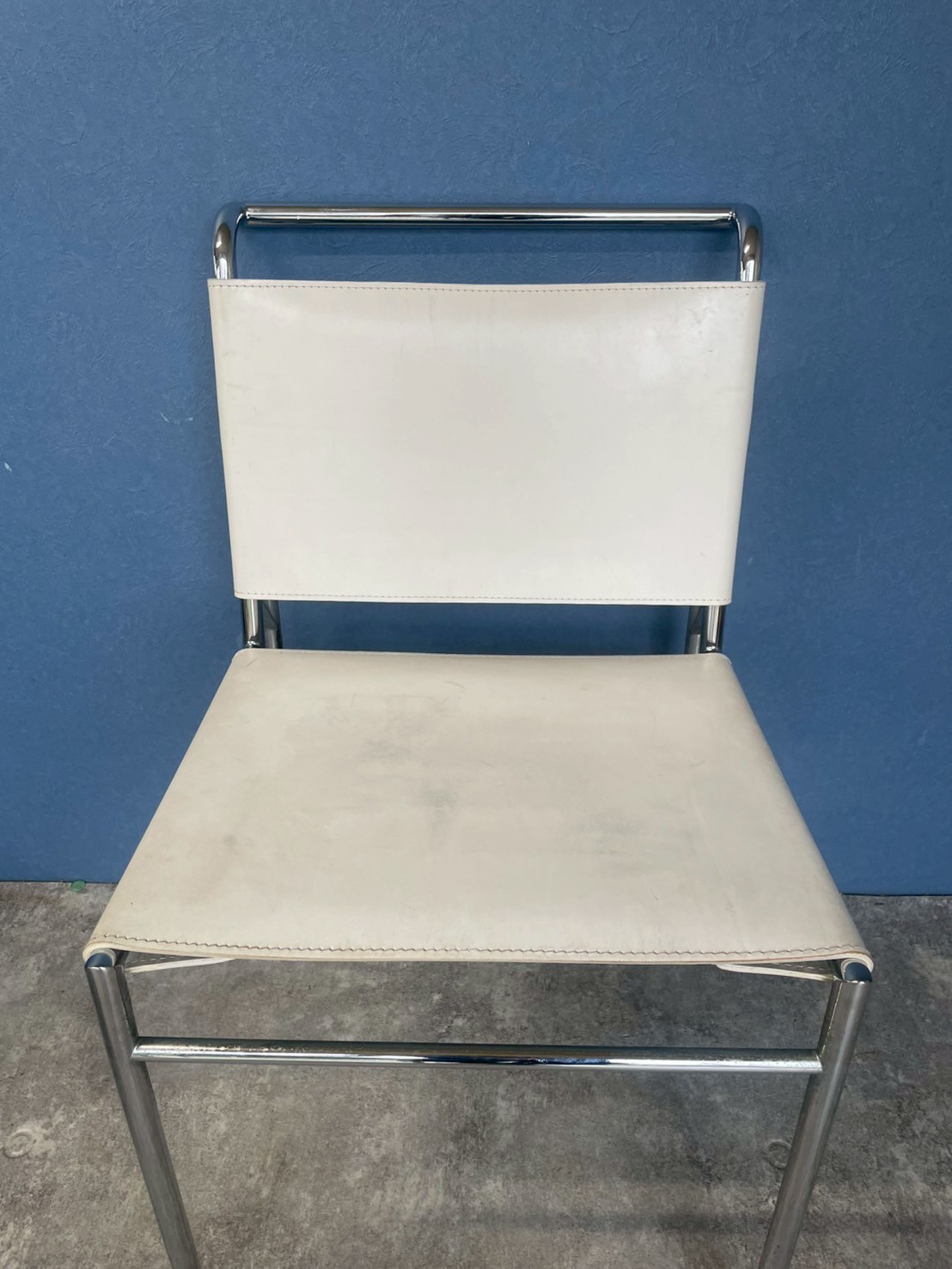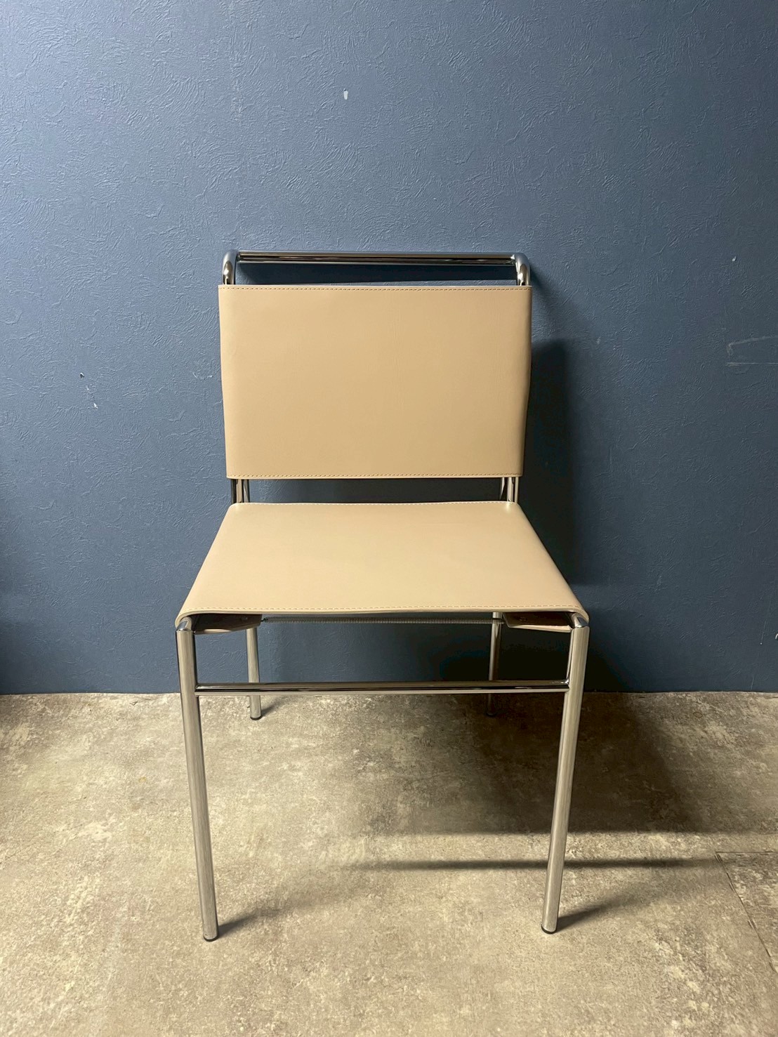 極限まで無駄を削ぎ落としたスチールパイプのフレームと、座る人の背中を優しく包み込む革の絶妙なバランス。