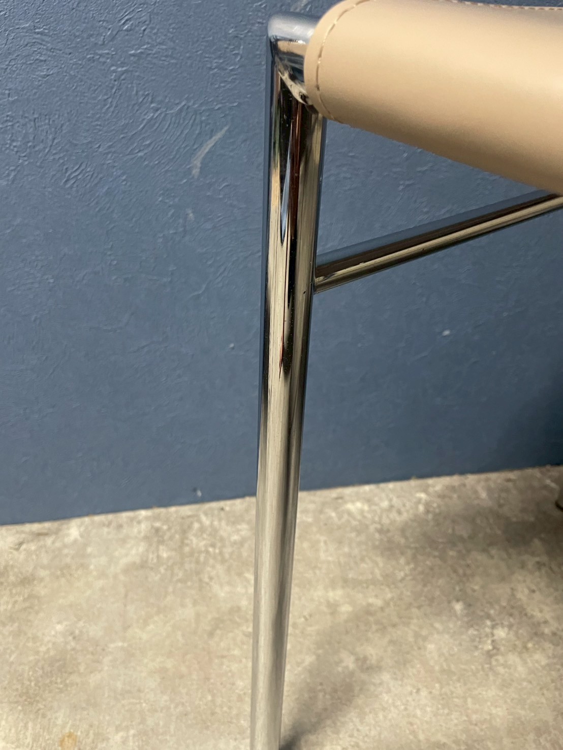 鏡面仕上げされたかのようなフレームに、新調したグレージュの革が椅子を取り替えたように綺麗になりました。