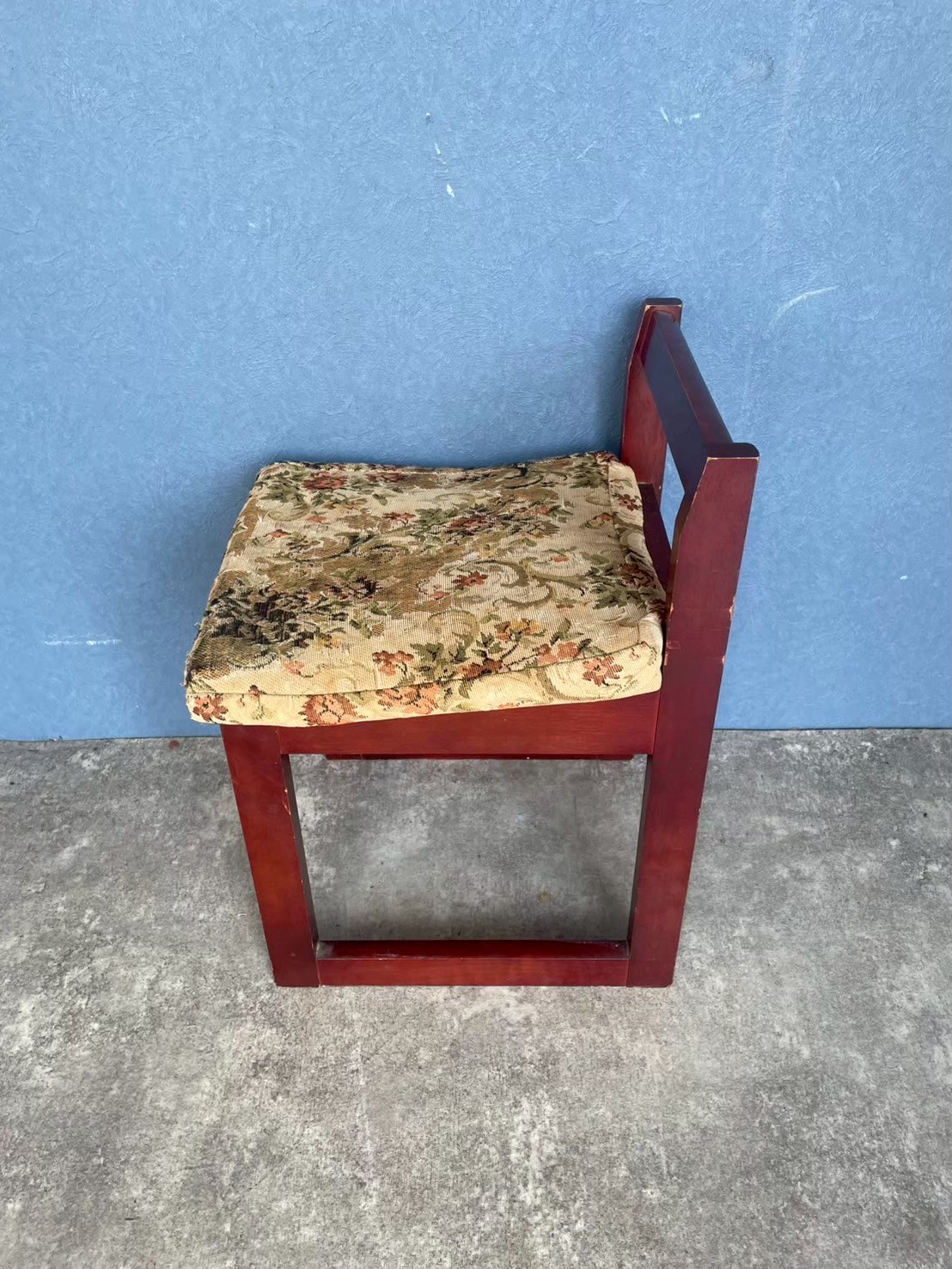 張り替え前の椅子は、木製のフレームに、かつては華やかだったであろうファブリックが張られたものでした。