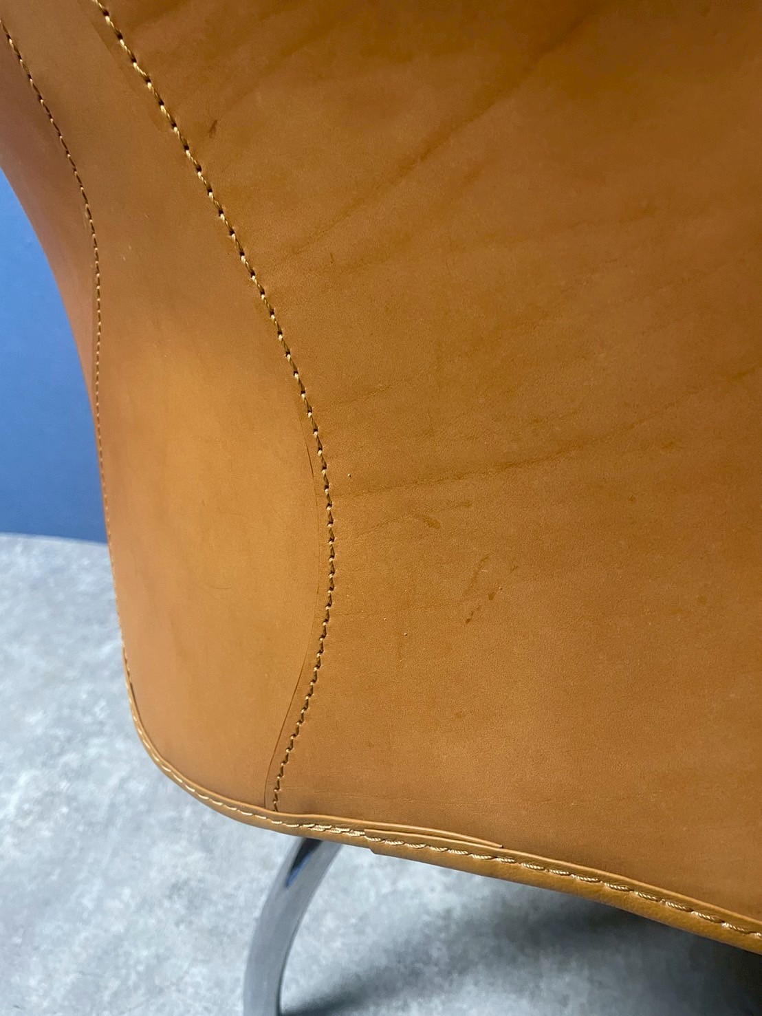 - 細かな擦り傷: 椅子を移動させる際や壁に接触した際にできたと思われる、銀面(革の表面)の細かな傷がいくつか散見されました。