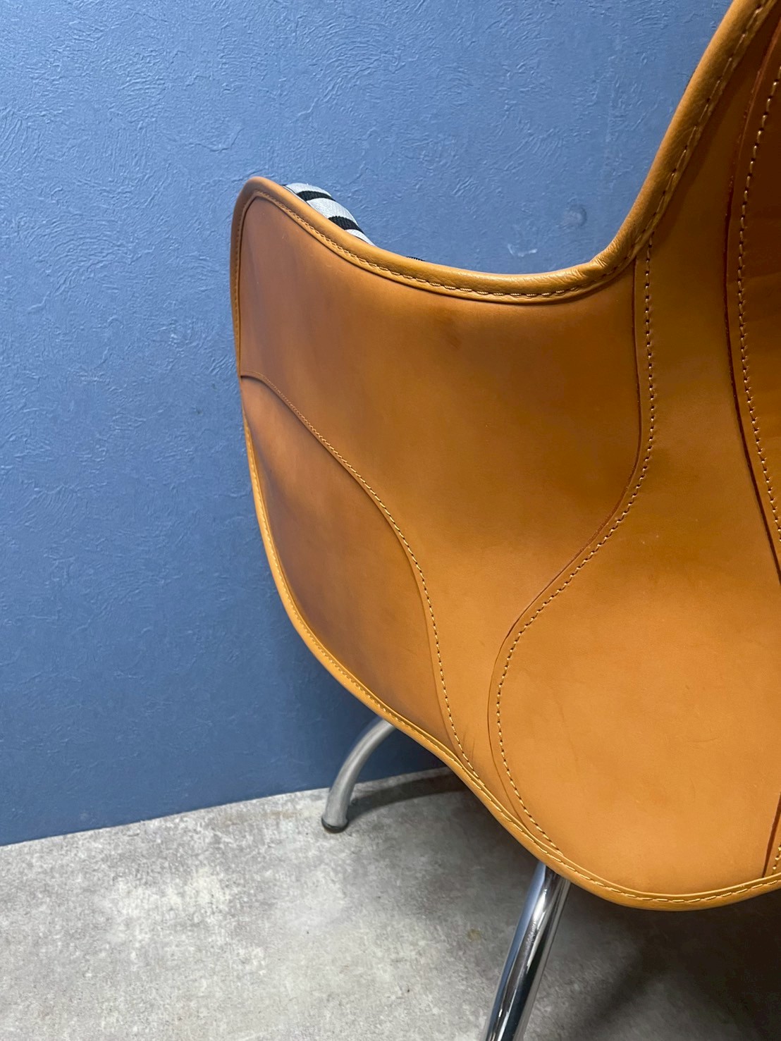 外側を覆う厚手で硬質なヌメ革と、内側の柔らかなファブリックやソフトレザーのコントラストがこの椅子のアイデンティティです。