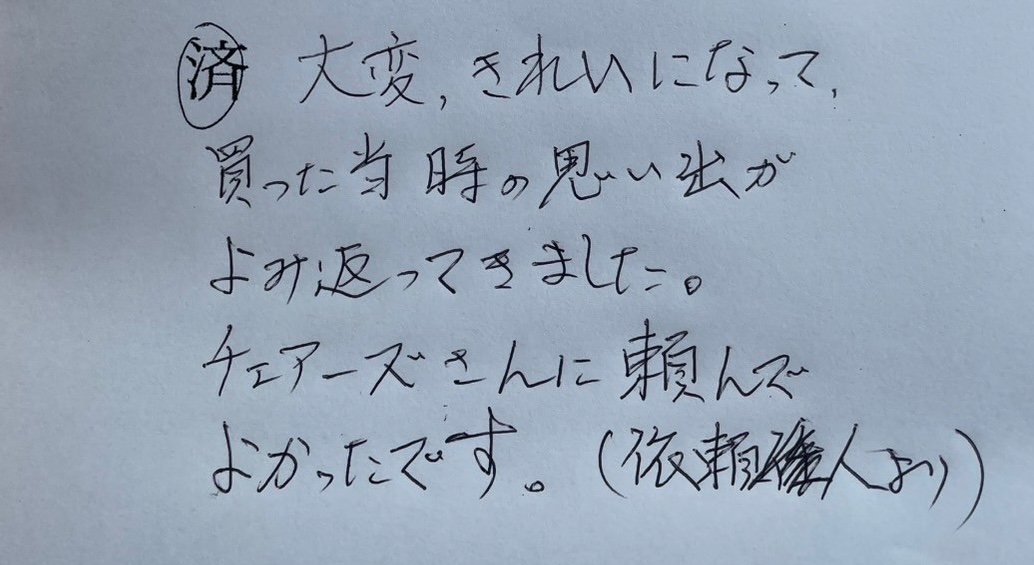 - 大変綺麗になって買った時の思い出が蘇ってきました。チェアーズさんに頼んでよかったです。