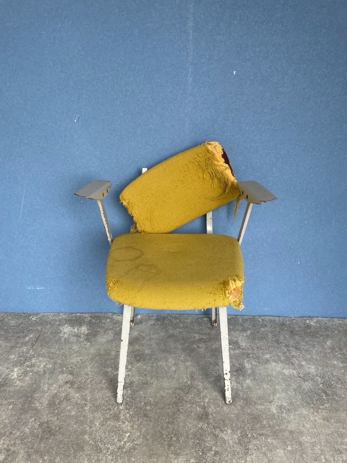 1脚は、鮮やかなイエローのファブリックで仕上げられた椅子でした。