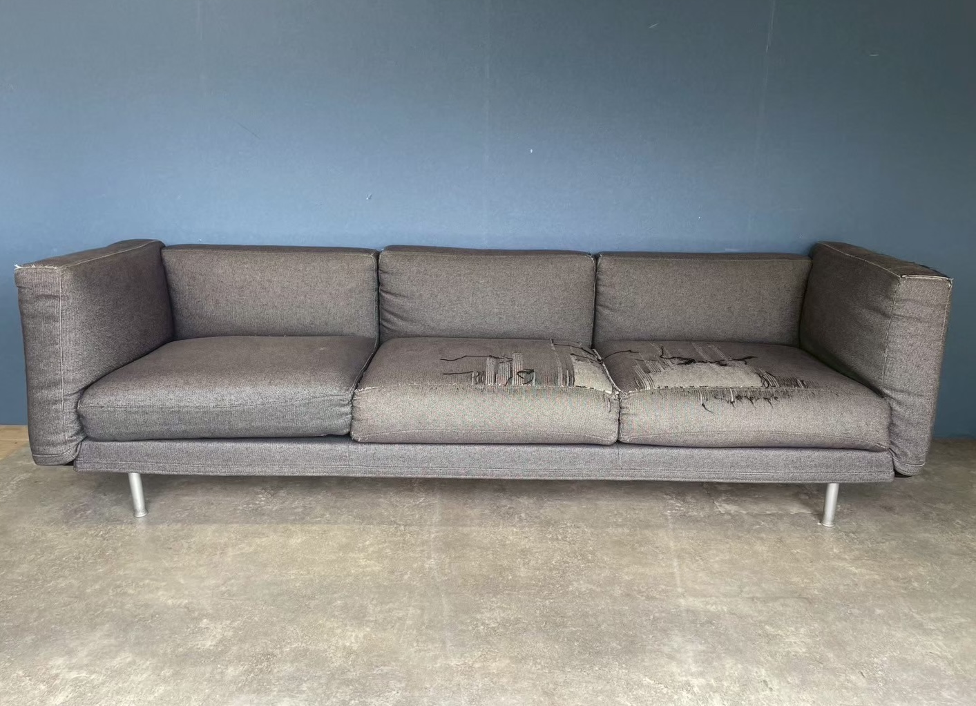 引き取りさせていただいたソファの座面の中央部分は大きく破れ、生地のベースが露出してしまっている状態でした。