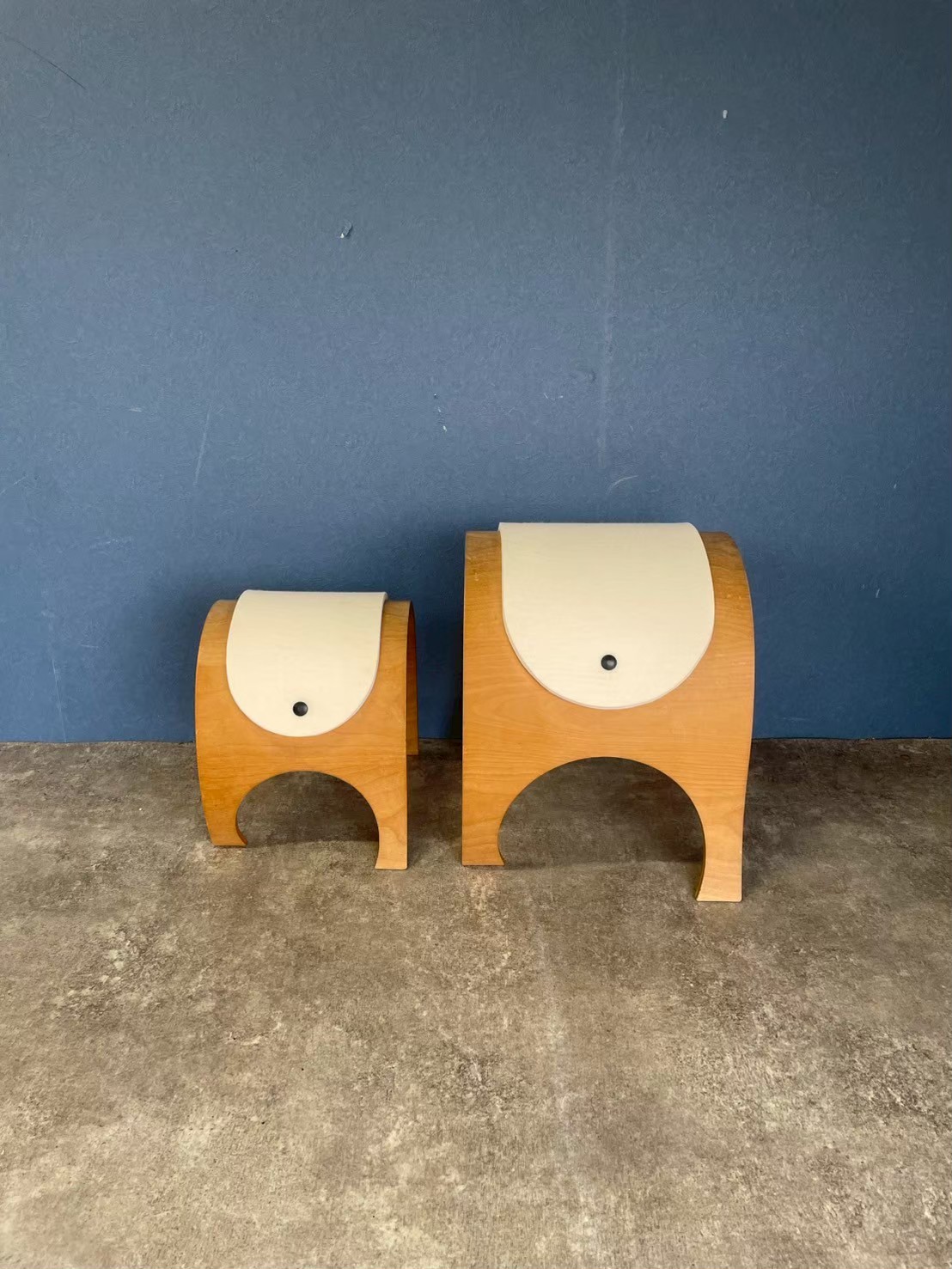 写真にある通り、大小2つのサイズがあり、親子のような、あるいは生き物のような愛らしい形が特徴的な一脚です。